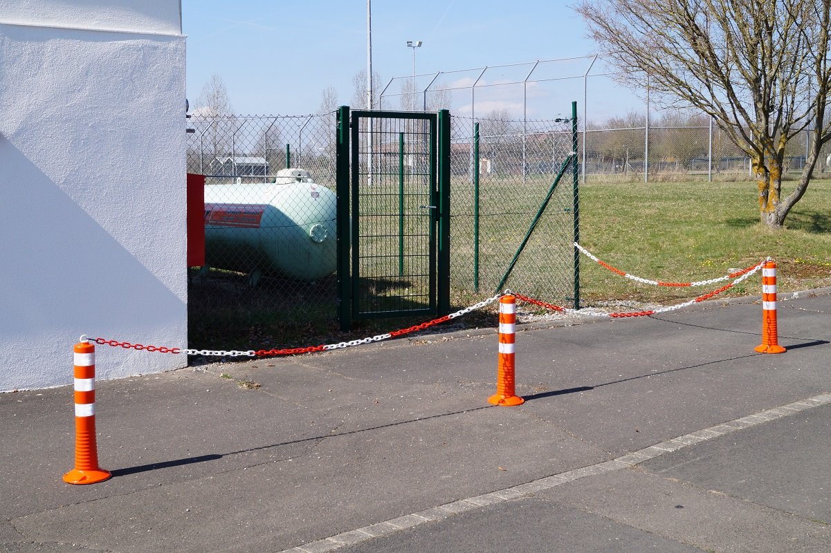 Paletti di grande diametro ideali per barriere con catena in plastica con filettatura M36 per accogliere occhielli e segnaletica.