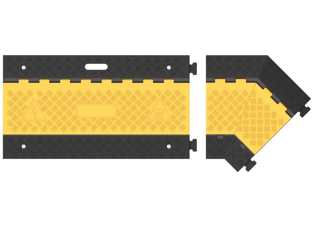 Ponte passacavi con coperchio giallo, robusto, in PE, con maniglia, espandibile a piacere tramite connettori, corpo in gomma riciclata nera, con 4 fori, possibile trasporto di carichi pesanti.