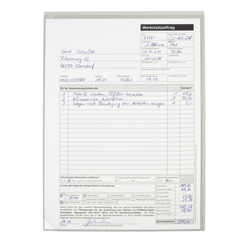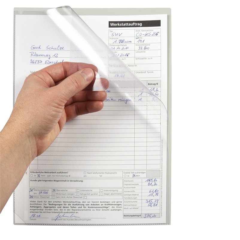 Busta di protezione leggera per ordini, con lato frontale in PVC trasparente e lato posteriore in PVC grigio – senza anima di cartone, adatta per un utilizzo non troppo intenso.