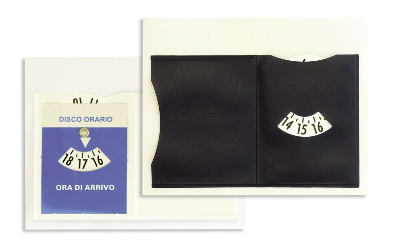 Disco orario adesivo con tasca in Finta Pelle e dischetto a rotella, fornito smontato, più tasca sempre in Finta Pelle con apertura laterale con unghiatura per inserimento del ticket.