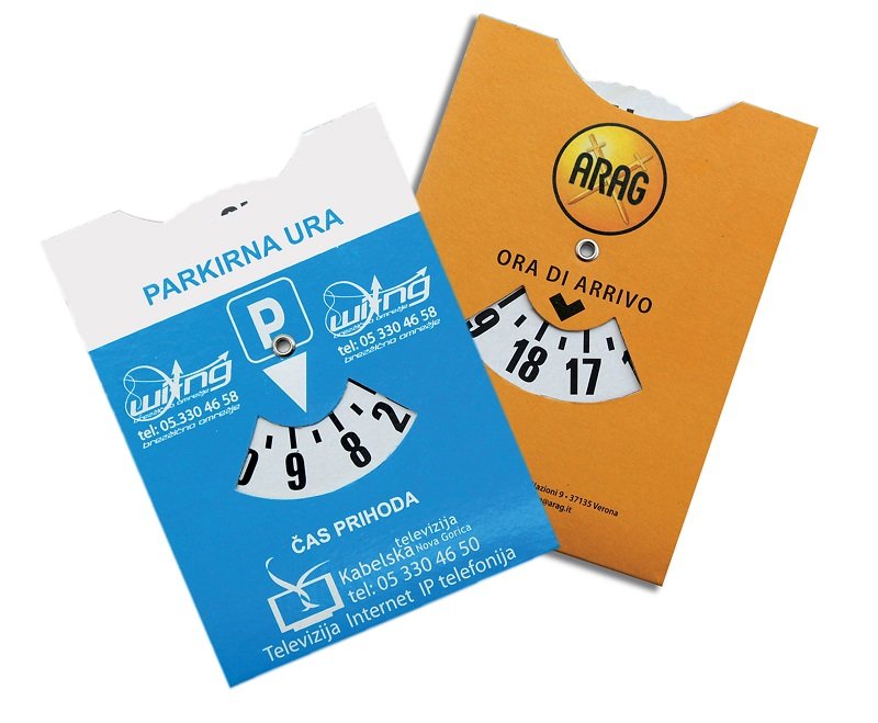 Disco orario in cartoncino plastificato compresa personalizzazione in quadricromia.