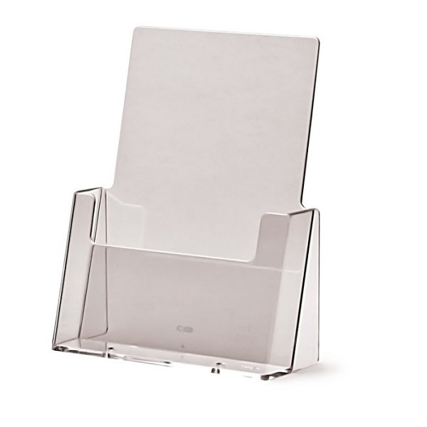 Porta depliant in plexiglass da banco per volantini formato A5. Espositore da tavolo per inserire depliant, cartoline, brochure formato 15x21H cm. Realizzato in polistirene trasparente adatto a tutti gli ambienti. Strumento utile per promuovere la tua attività in ogni occasione. Il fronte del porta depliant può essere personalizzato con un adesivo o con una stampa in serigrafia. Il porta depliant è disponibile anche nel formato A5 orizzontale o con 4 vaschette A5.