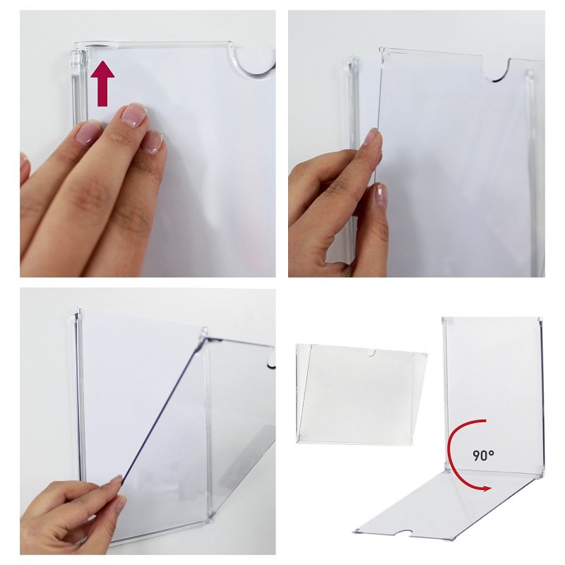 Pratico, veloce e trasparente: Flap, la tasca porta informazioni e porta avvisi brevettata può essere fissata su tutte le superfici tramite nastro biadesivo. Flap può essere perfettamente fissata anche su superfici lisce come il vetro. Fissando la tasca internamente, l’informazione è leggibile anche dall’esterno. Il policarbonato stampato ad iniezione è antigraffio e garantisce una durata notevole del prodotto. Il pannello frontale può essere semplicemente aperto sgangiando la parte superiore oppure staccato e rimosso completamente. La tasca per fogli singoli è ideale per la segnaletica semplice montata a muro o come portaprezzi.