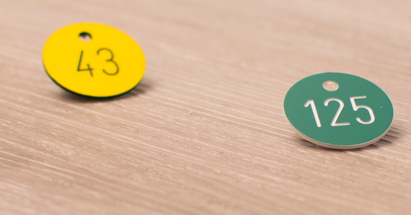 Dischetti in plastica con foro e gancio a S , incisi con numeri