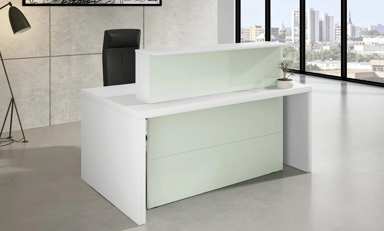 Banco reception Verona Compact Il banco reception dal design lineare è una solida struttura in legno. I pannelli in legno sono rivestiti in melaminico con bordi in ABS. Il piano scrivania e i pannelli laterali hanno uno spessore di 50 mm. Il banco reception è disponibile in bianco. I frontali sono decorati in vetro. Il piano scrivania ha una profondità di 100 cm. 80 cm della profondità totale del piano scrivania possono essere utilizzati come piano di lavoro e i restanti 20 cm come ripiano portaborse. Il piano scrivania è dotato di un passacavi integrato. L’altezza totale del banco reception è di 112 cm.