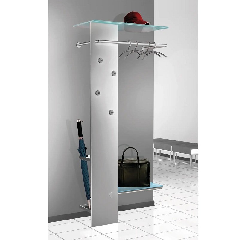 Realizzata in acciaio verniciato a polvere color argento alluminio. Porta cappelli in vetro di sicurezza trasparente.